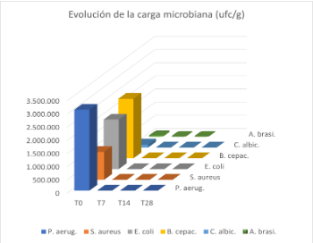 The graph shows that initally all microorganisms start from high loads at T0, but, disappear after 7 days and remain absent until T28, with no evidence of regrowth, demonstrating the effetiveness of ACTIOL GLYCAPRO in quickly and sustainably controlling the microbial load.
