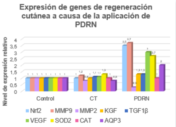 La aplicación de PDRN incrementó de forma significativa la expresión de genes clave implicados en la regeneración y calidad de la piel, como KGF, VEGF, SOD2 y AQP3, superando tanto al control como al ADN convencional. Paralelamente, moduló favorablemente la actividad de metaloproteinasas al reducir MMP2, relacionada con la degradación de la matriz dérmica, y regular MMP9, asociada a procesos de remodelación tisular.