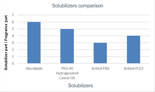 Entre los solubilizantes no etoxilados (Glycolipids y ACTISOL PLG2), nuestro activo ACTISOL PLG2 demuestra una mayor eficiencia, ya que requiere menor cantidad para solubilizar el perfume. Los otros dos solubilizantes evaluados (PEG-40 Hydrogenated Castor Oil y Actisol FRA) son etoxilados.