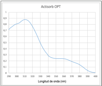 Curva de absorción UV de ACTISORB OPT en solución etanólica (14 ppm):