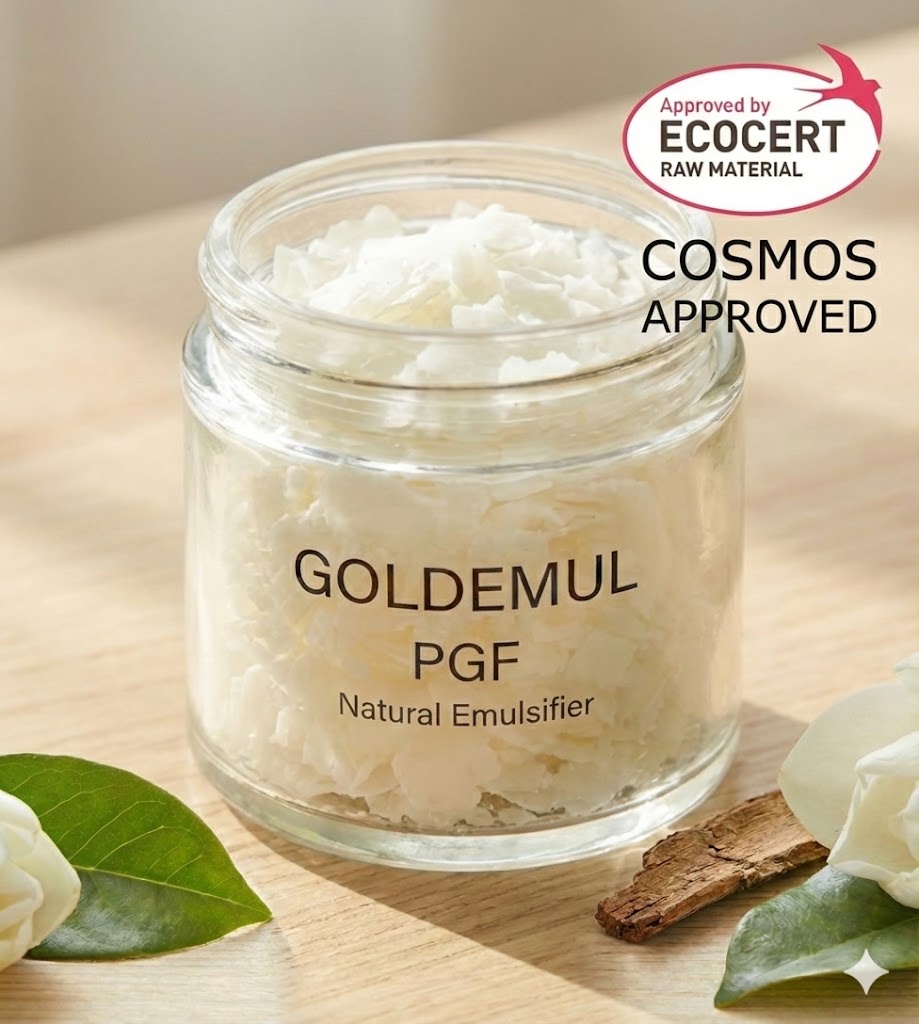 GOLDEMUL PGF: Emulsionante universal de tipo O/W no etoxilado con origen natural vegetal. Aspecto sólido, ceroso y blanquecino. Punto de fusión: 65ºC. INCI: Glyceryl Stearate Citrate, Polyglyceryl-2 Distearate, Cetearyl Alcohol, Hydrogenated Coco-Glycerides. Dosis de uso: del 5% al 15%