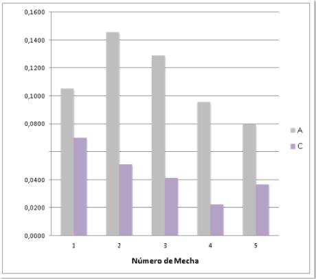 Las mechas tratadas con el champú A (columnas grises) mostraron una diferencia de peso del 46% respecto a las tratadas con el champú B (columnas moradas), tras 4 horas de secado en comparación con su peso inicial antes de la aplicación del producto. Esta diferencia es estadísticamente significativa (p < 0,05), indicando una mejor retención de humedad y acondicionamiento capilar con el champú A.